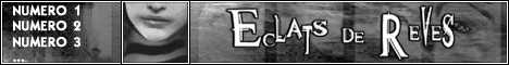 Bienvenue sur le site du fanzine Éclats de Rêves. Nous sommes heureux de vous accueillir et de vous compter parmi nos visiteurs. Nous espérons que vous passerez un agréable moment en notre compagnie et que vous serez curieux de découvrir les textes cachés dans les pages de notre fanzine. 14/12/2006